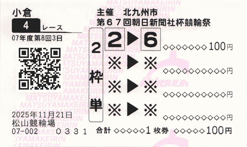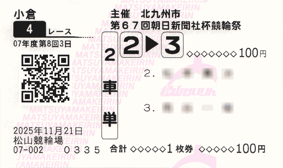 - 購入例:2車単で第4レース2を軸に1・9を100円ずつ購入