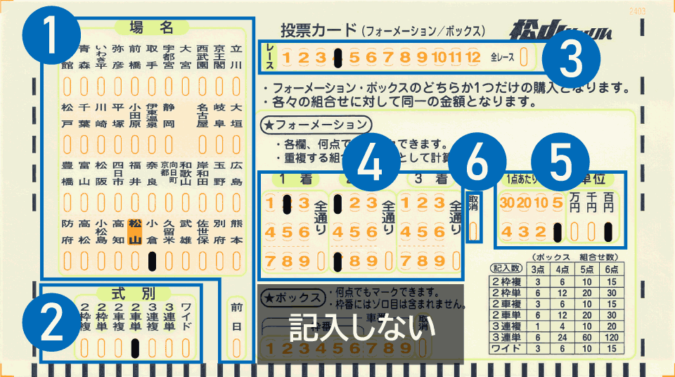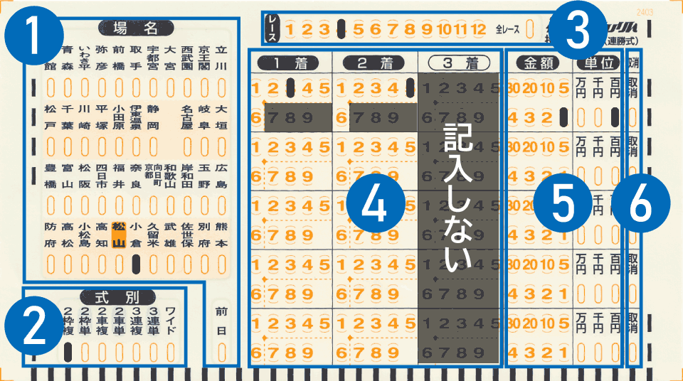 - 組番 購入する枠番(1~6枠)を、着順につき1つだけ塗りつぶします。1~2着に入る枠番を着順に関係なく塗りつぶします。