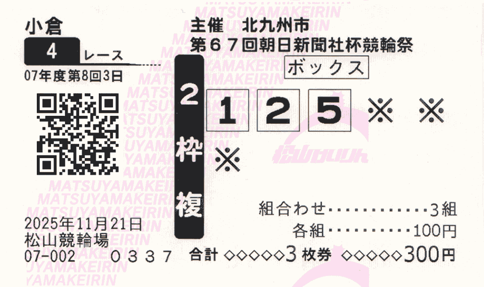 - 購入例:2枠複で第4レース1-2-5を100円ずつ購入