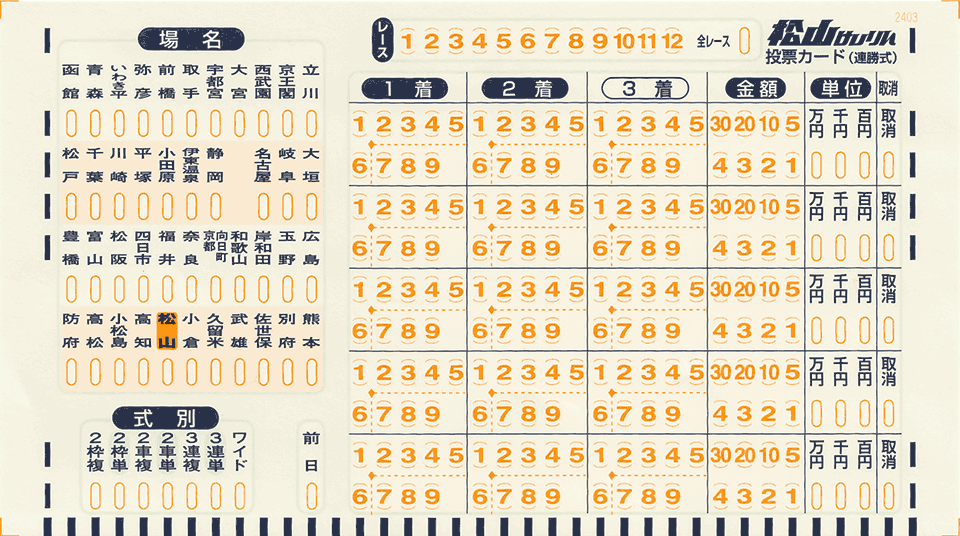 前日に投票する場合は「前日」を塗りつぶします。 - 式別 購入する車券の種類を塗りつぶします。