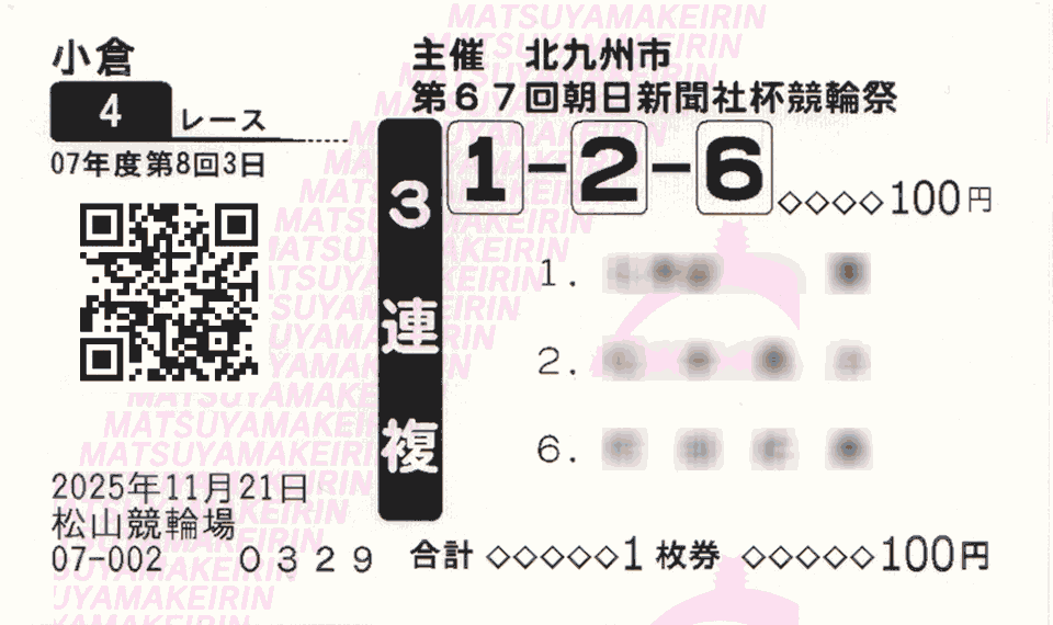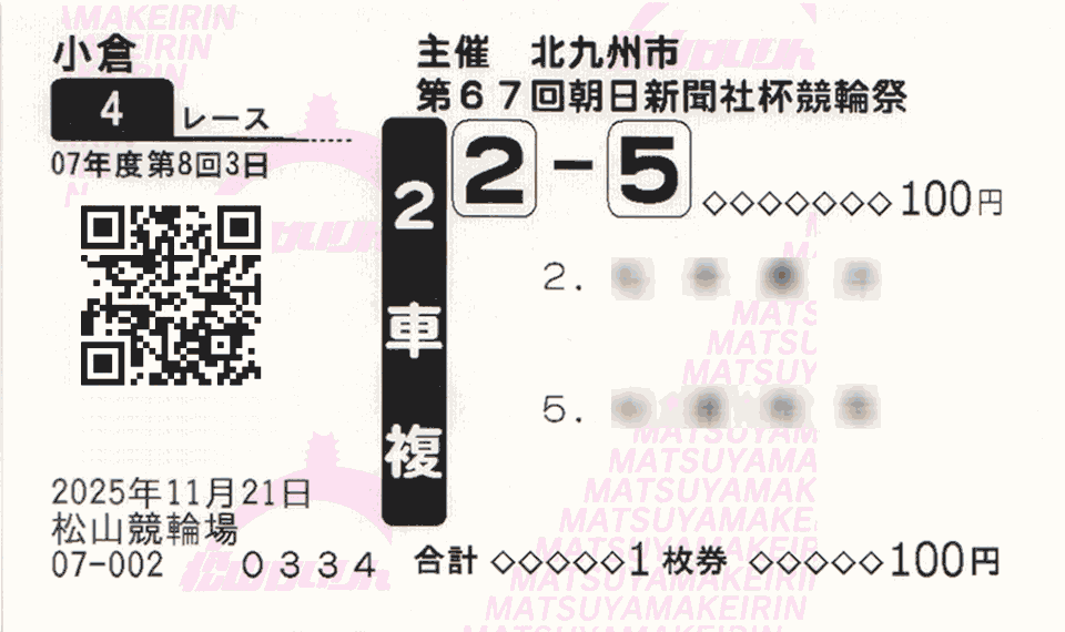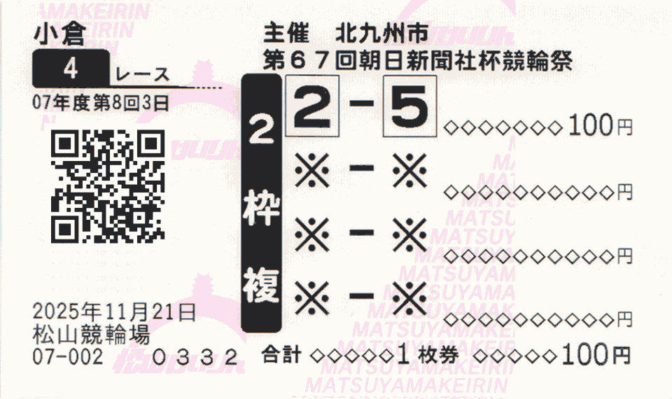 - 購入例:2枠複で第4レース1-2-5を100円ずつ購入