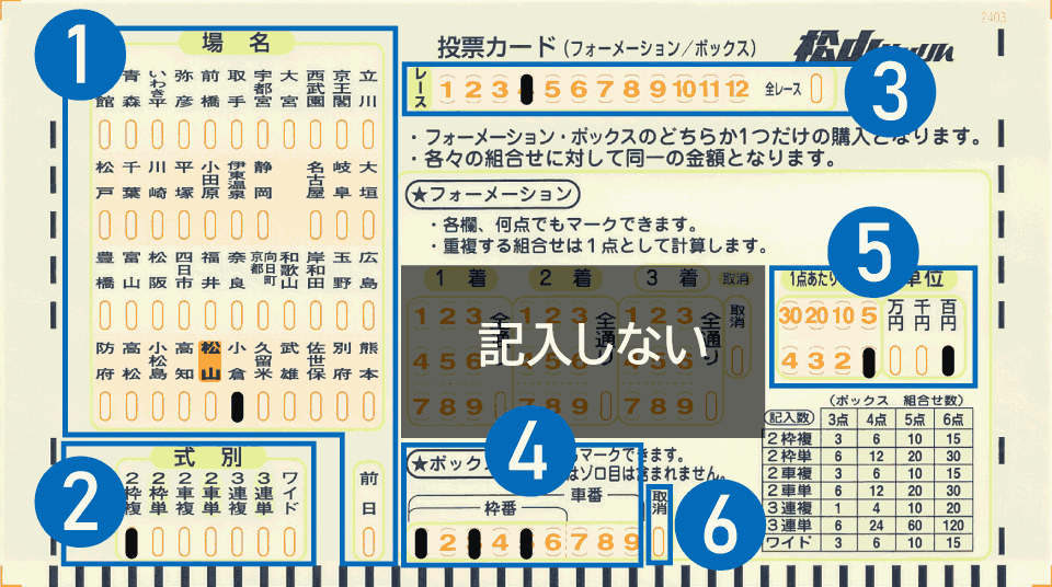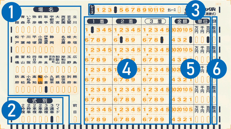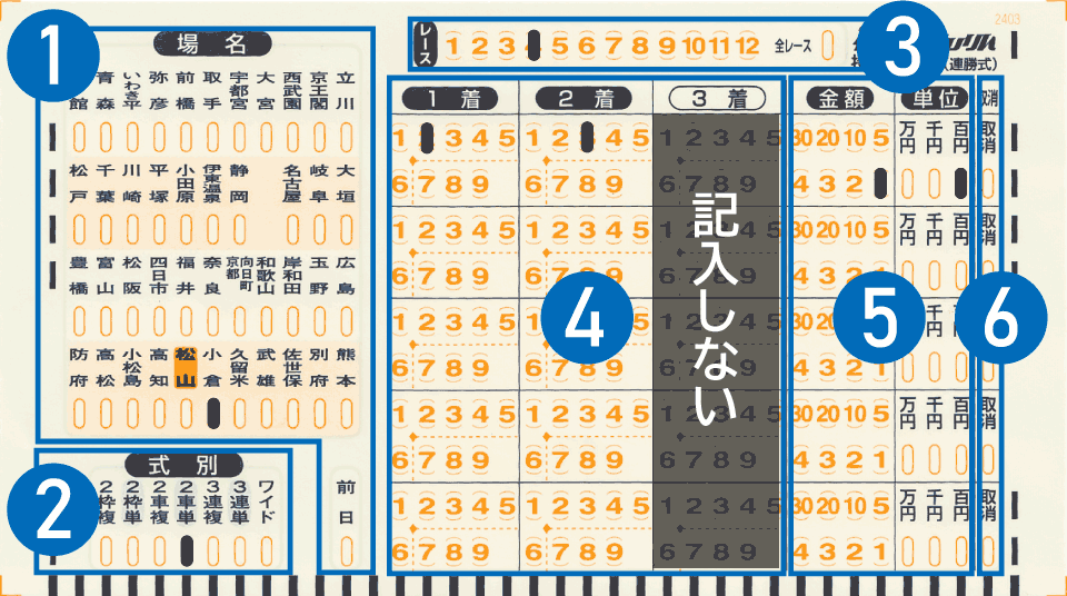 - 組番 購入する枠番(1~6枠)を、着順につき1つだけ塗りつぶします。1~2着に入る枠番を着順に関係なく塗りつぶします。