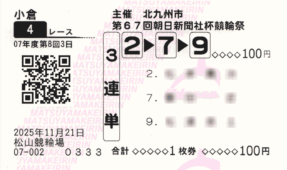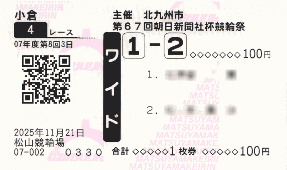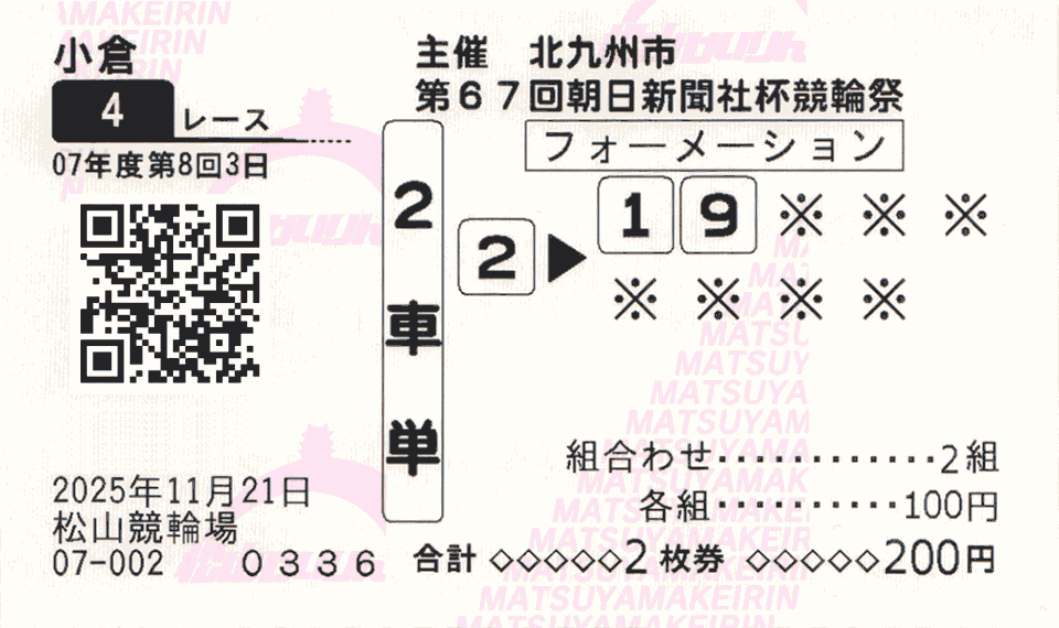 - 購入例:2車単で第4レース2を軸に1・9を100円ずつ購入
